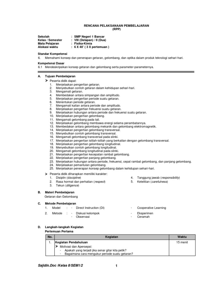 Rpp Fisika Smp Kelas 8 Getaran Dan Gelombang
