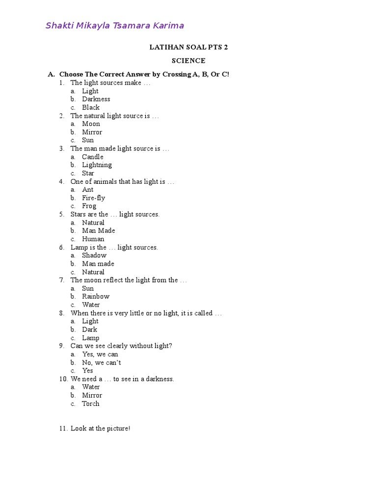 Kelas 2 Latihan Soal Pts 2 Science Shadow Light