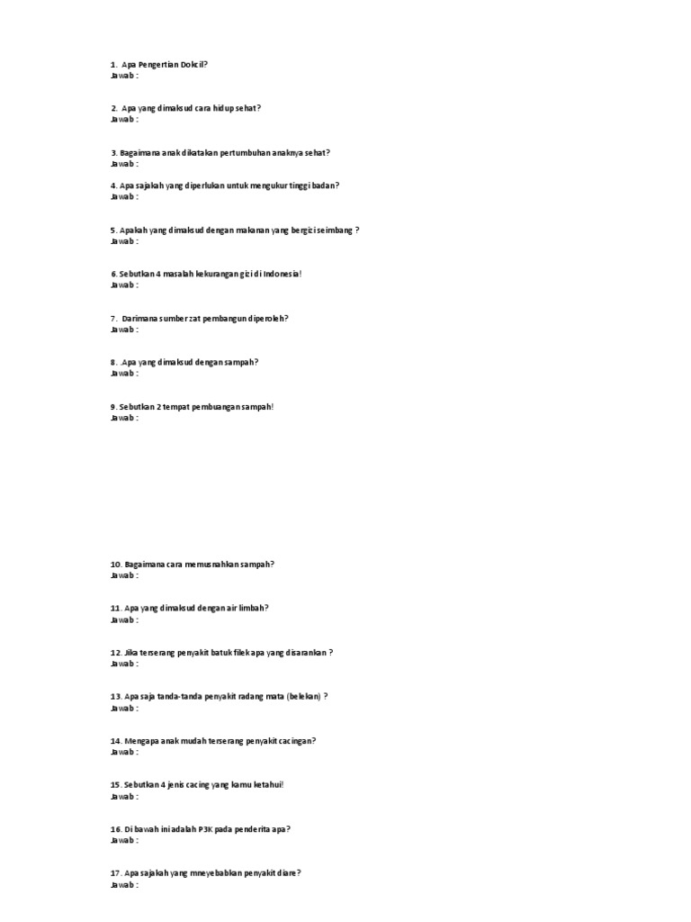 Kumpulan soal dokter kecil tingkat sd dan kunci jawaban. Soal dan jawaban dokter kecil dokcil tahun 2019 dokter kecil 2019 salah satu kegiatan yang akan dilaksanakan pada jenjang sd sekolah dasar untuk kegiatan kesehatan. Soal dokter kecil sd dan kunci jawabanBerikut ini adalah download silabus dan rpp kurikulum 2013 sd mismp mtssma smk ma semester 1 lengkap yang merupakan kumpulan file dari berbagi sumber 2017 tentang soal. Oleh alasannya itu berikut admin berikan beberapa Soal dan Jawaban Dokter Kecil Dokcil Tahun 2019 yang diperlukan sanggup dijadikan rujukan penambah pengetahuan dalam mempersiapkan siswa-siswi dalam mengikuti.