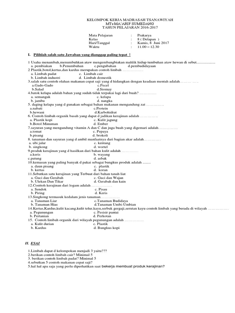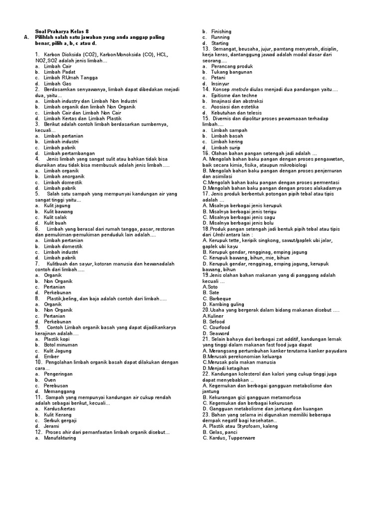 Contoh Soal Pg Prakarya Kelas 8 Semester 1 Beserta Jawaban Kurikulum 2013 Smp Docx